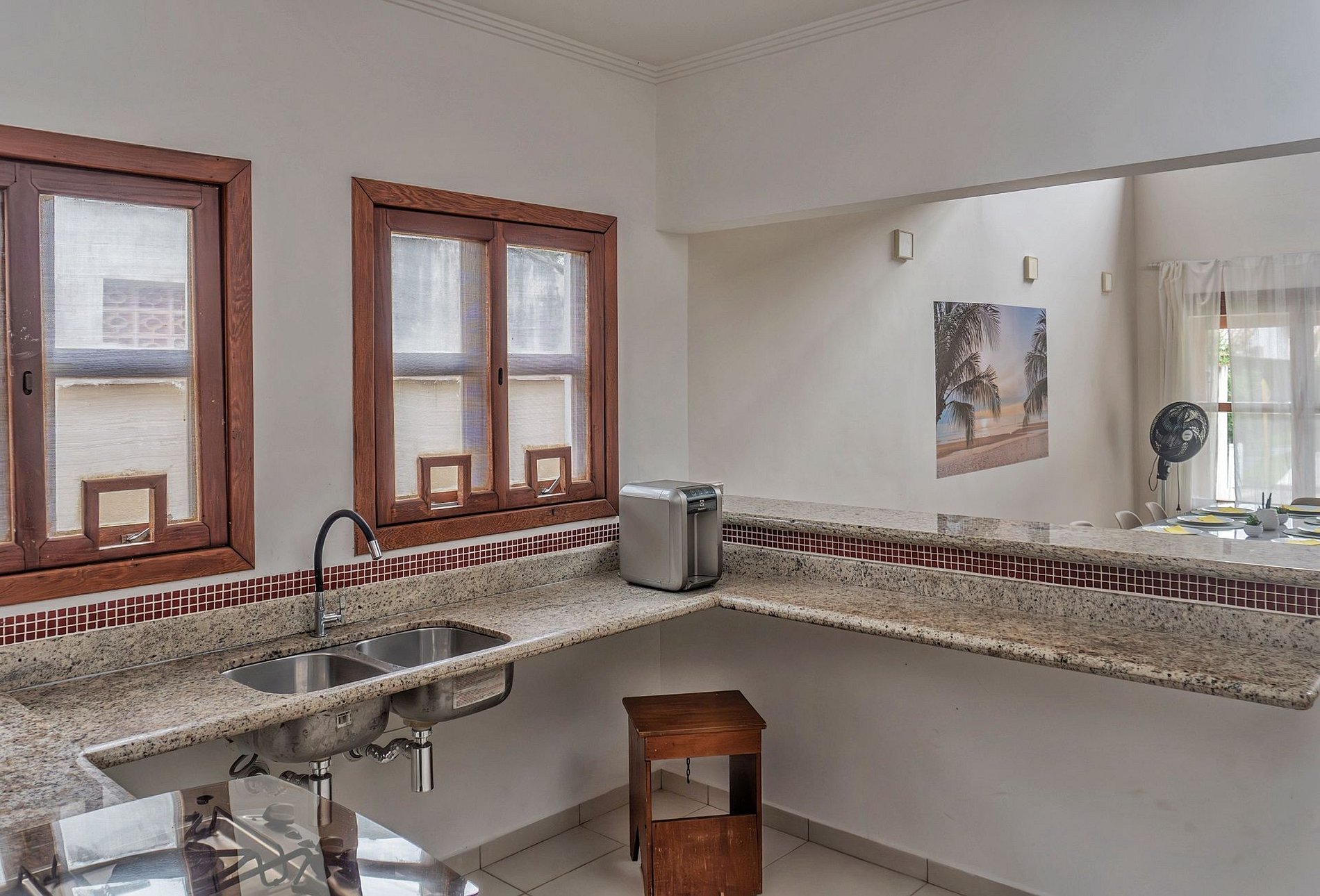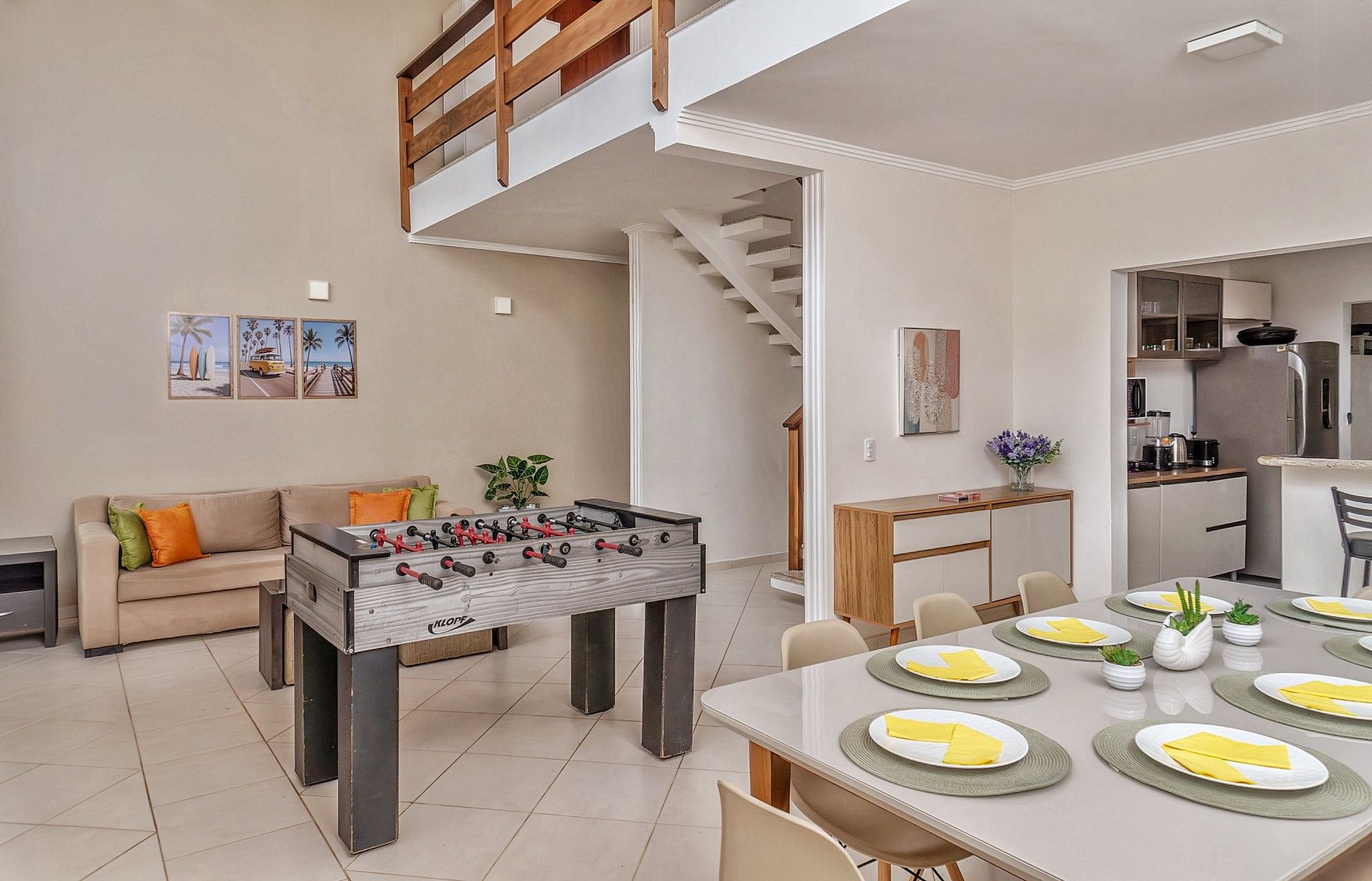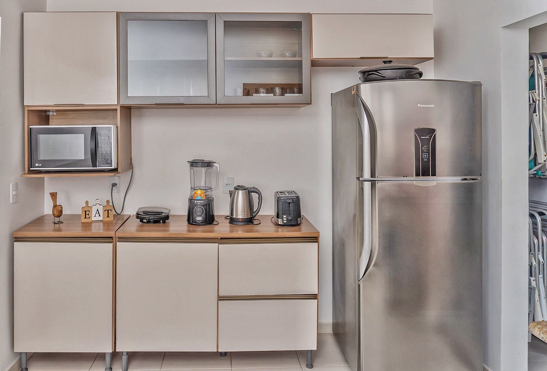 Sala ampla e cozinha americana completa, ideais para refeições práticas e aconchegantes.