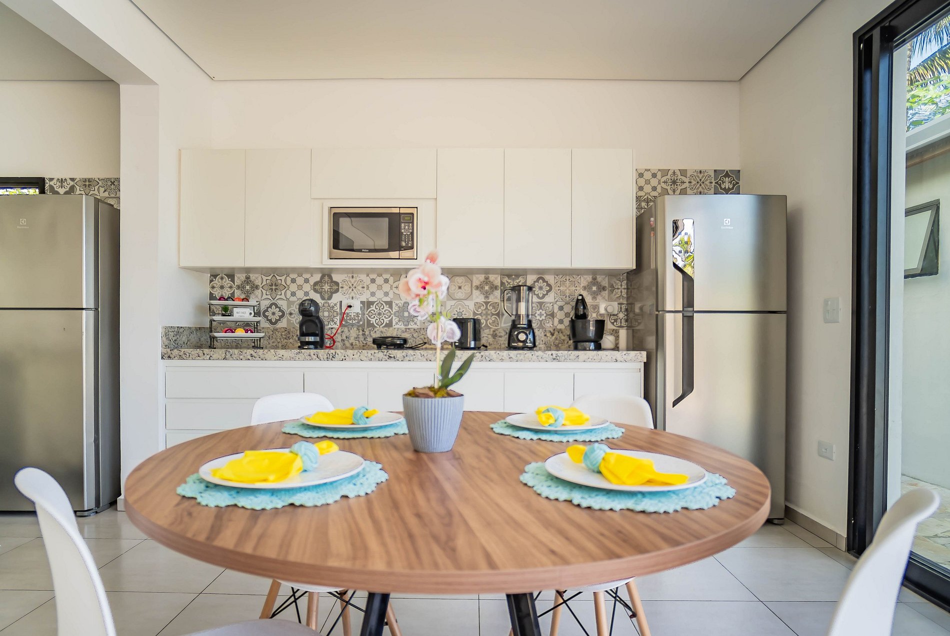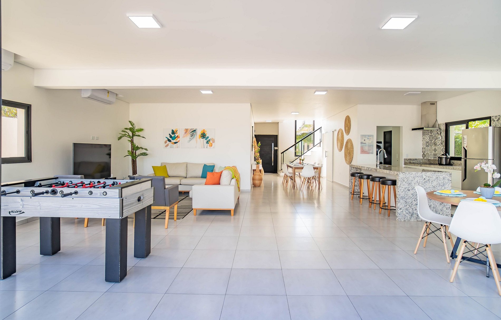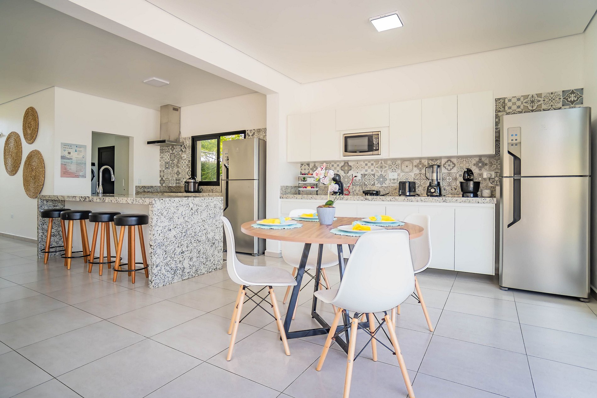 Sala ampla e cozinha americana climatizadas e totalmente equipadas, perfeitas para refeições aconchegantes.