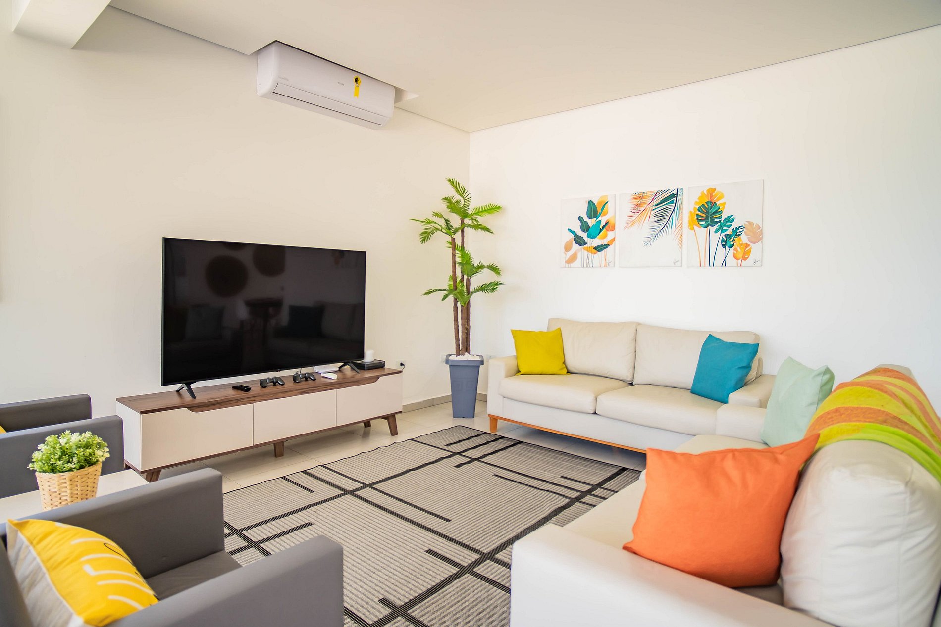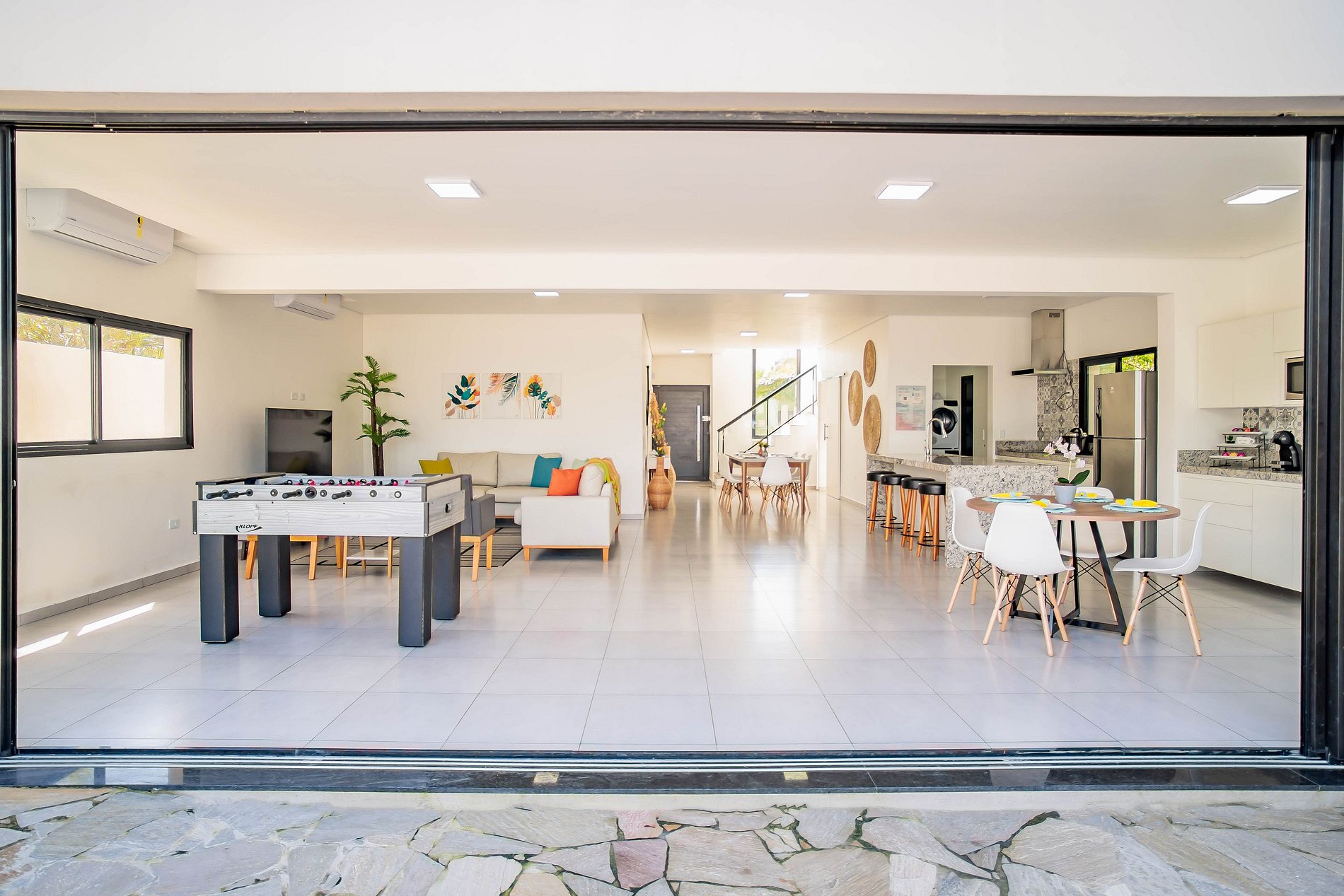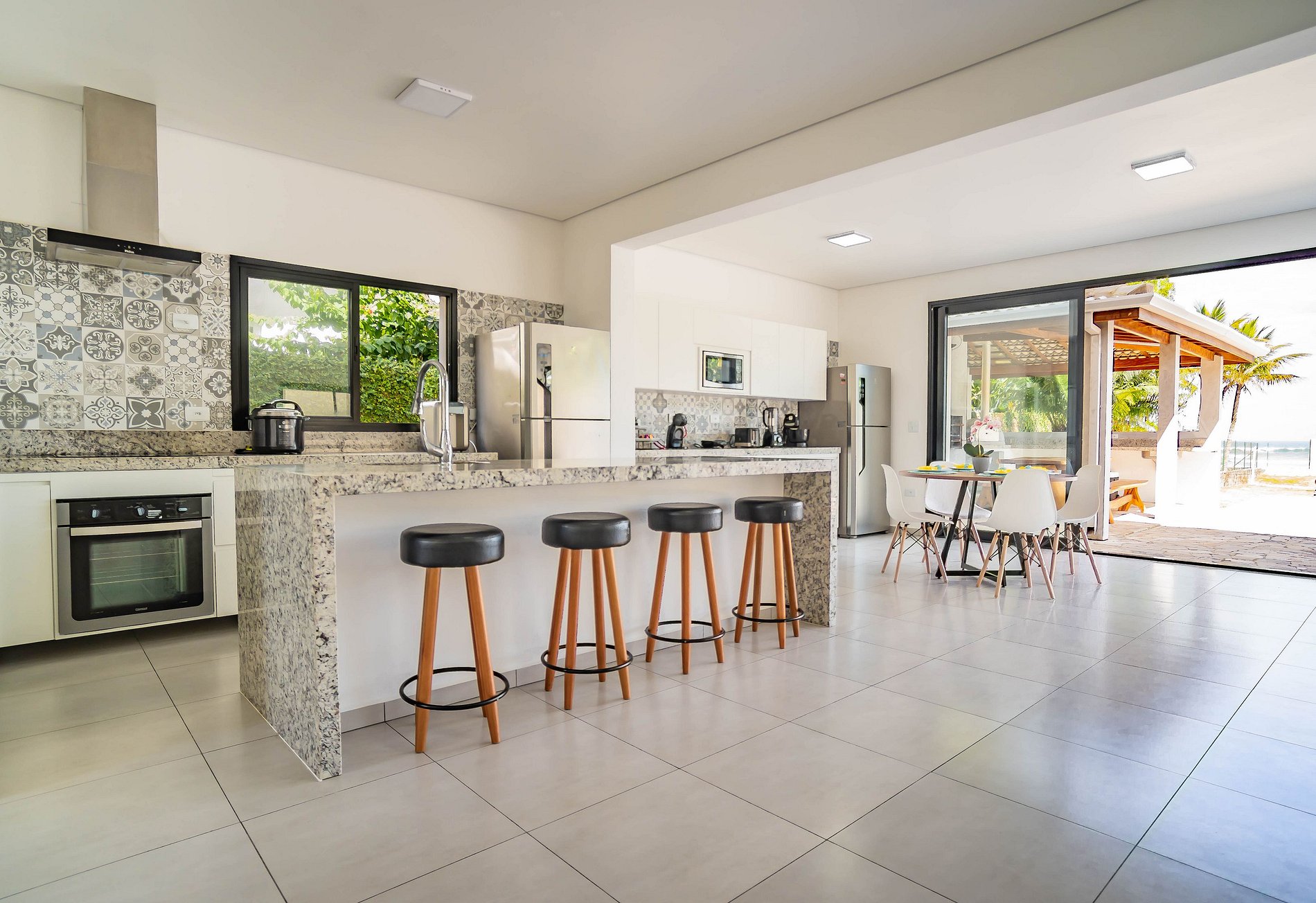 Sala ampla e cozinha americana climatizadas e totalmente equipadas, perfeitas para refeições aconchegantes.