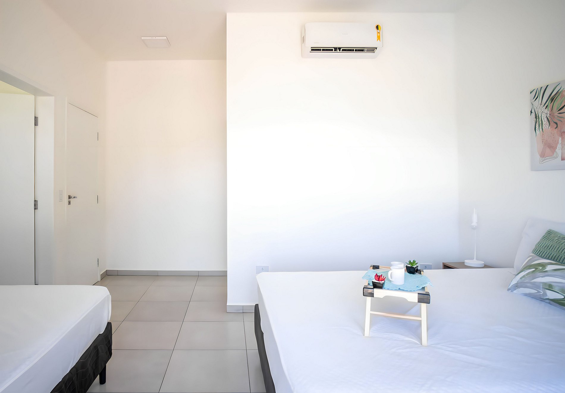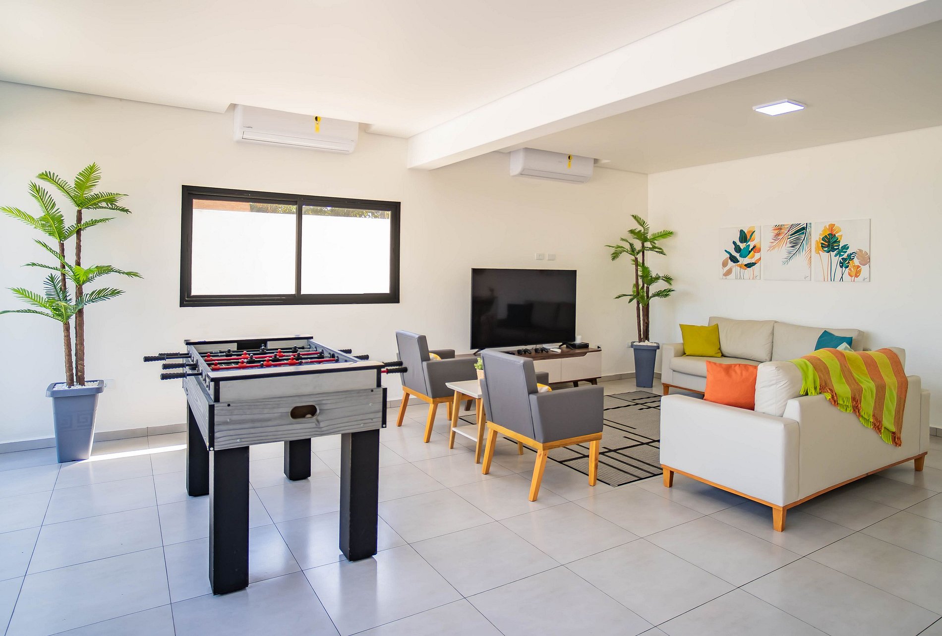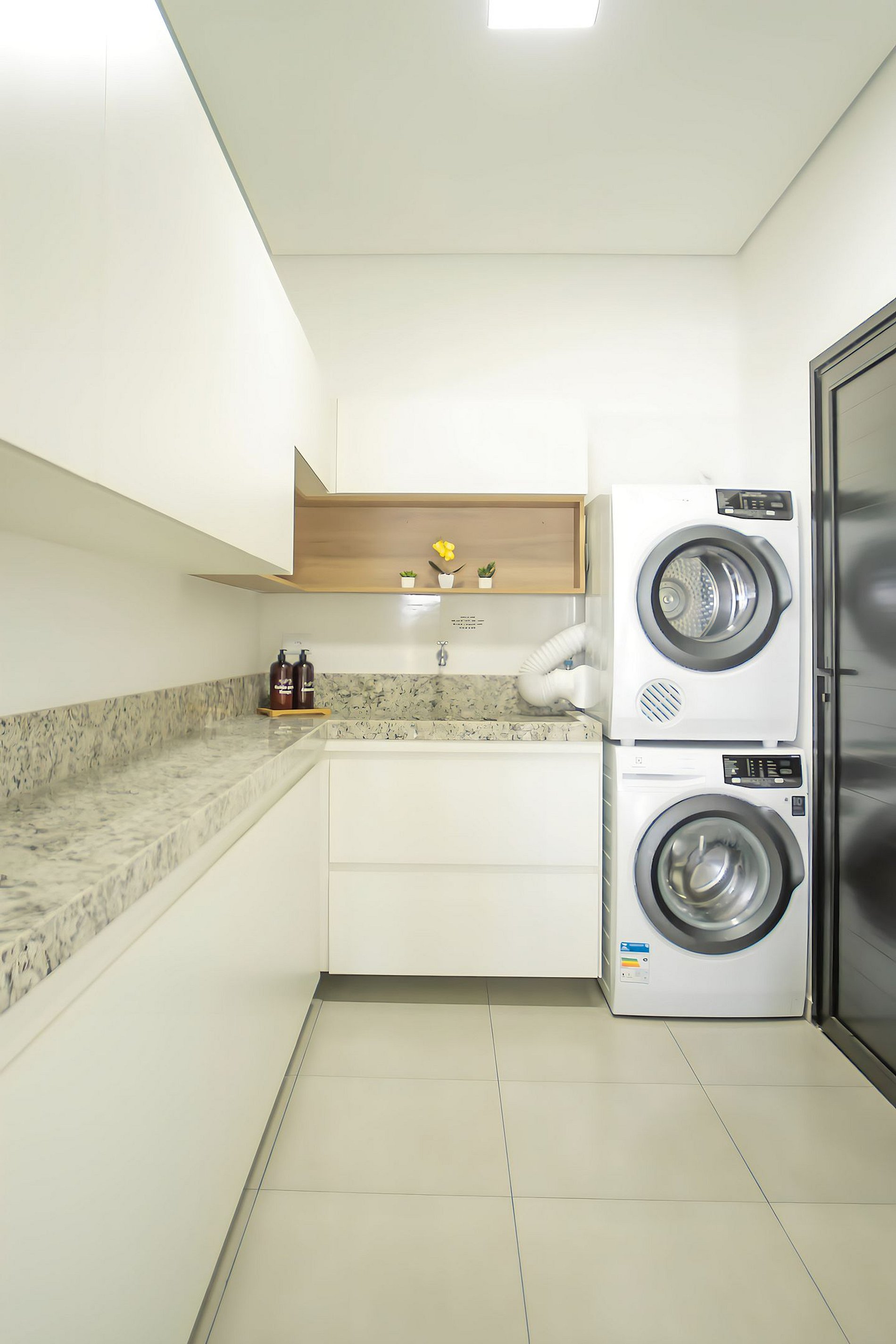 Espaços Integrados e Equipados: A sala e a cozinha em estilo americano são climatizadas e totalmente equipadas. Além disso, há uma lavanderia com lavadora e secadora para sua comodidade.